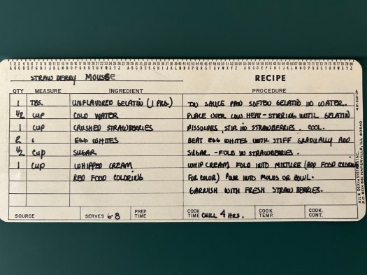 Better yet see Strawberry Mousse for the recipe. 2017! I totally forgot I posted the recipe at some distant time in the past. Yup, I’m embarrassed.