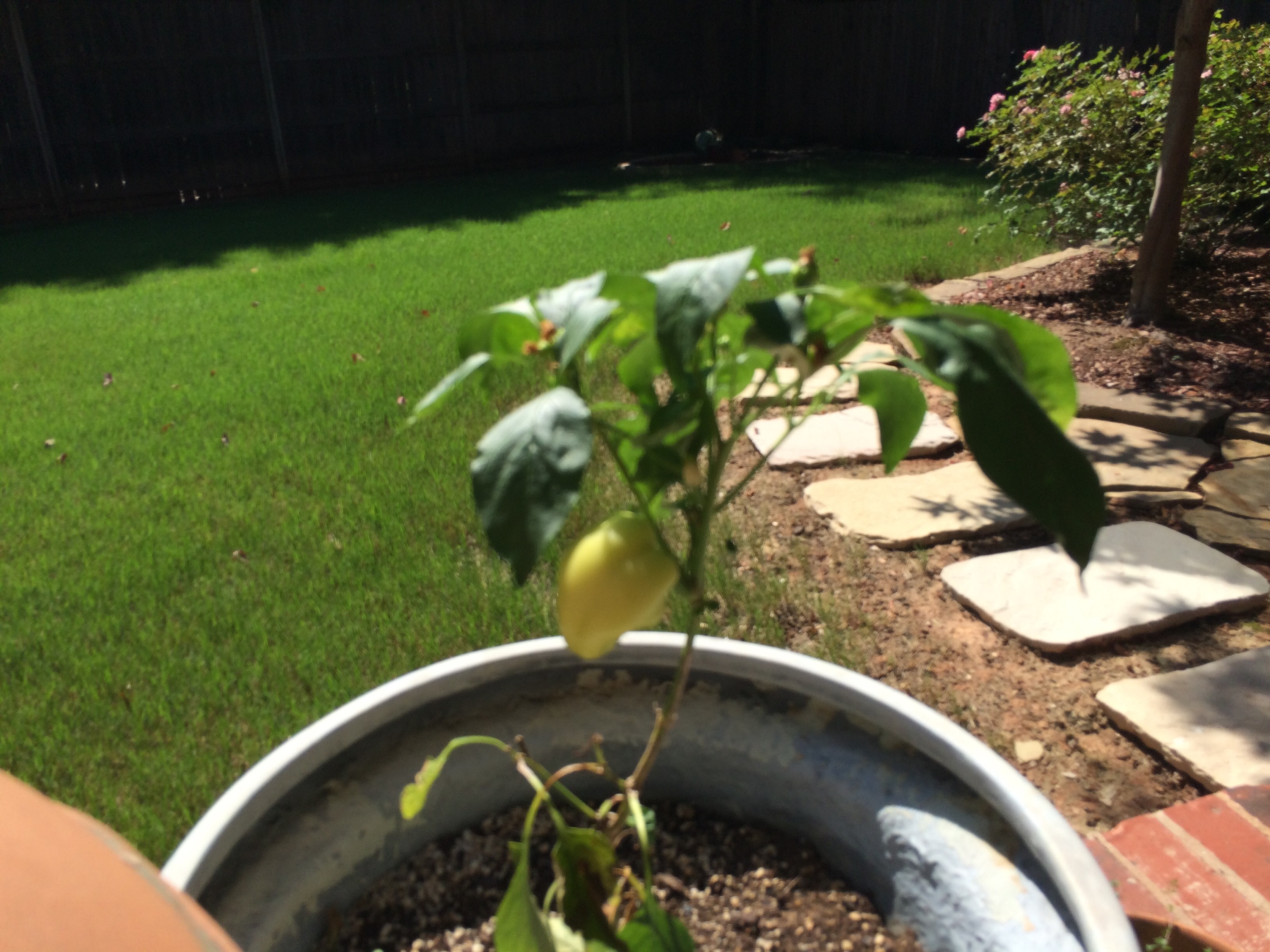 I lost another pepper. Note the pepper on the left which I was hoping to vine ripen has split and rotted. This is the second pepper I’ve lost to rot. Fully one third of my summer crop has rotted away. But if the remaining four fruit survive this will be my most successful attempt at growing fruits in pots. A few summers ago my tomato plant produced two tomatoes. Then I tried cucumbers. Only got one. This pepper plant is actually growing peppers!