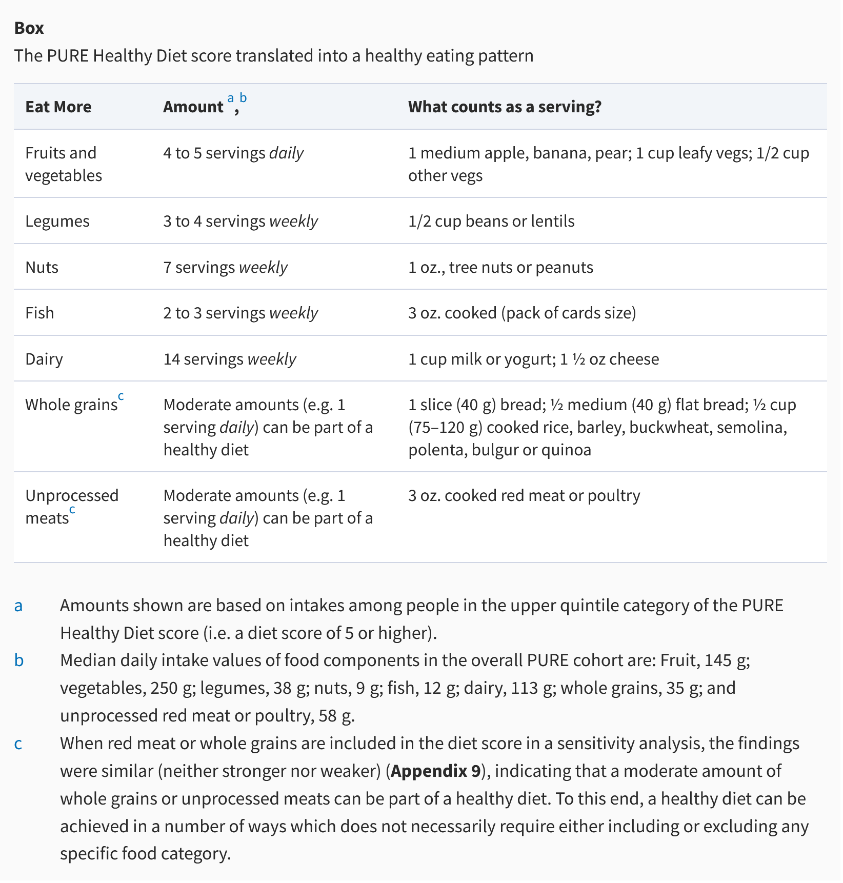 Our findings suggest that globally the key to a healthy diet is probably one that includes diverse natural foods in moderation, rather than restricting intake to a small number of food categories.