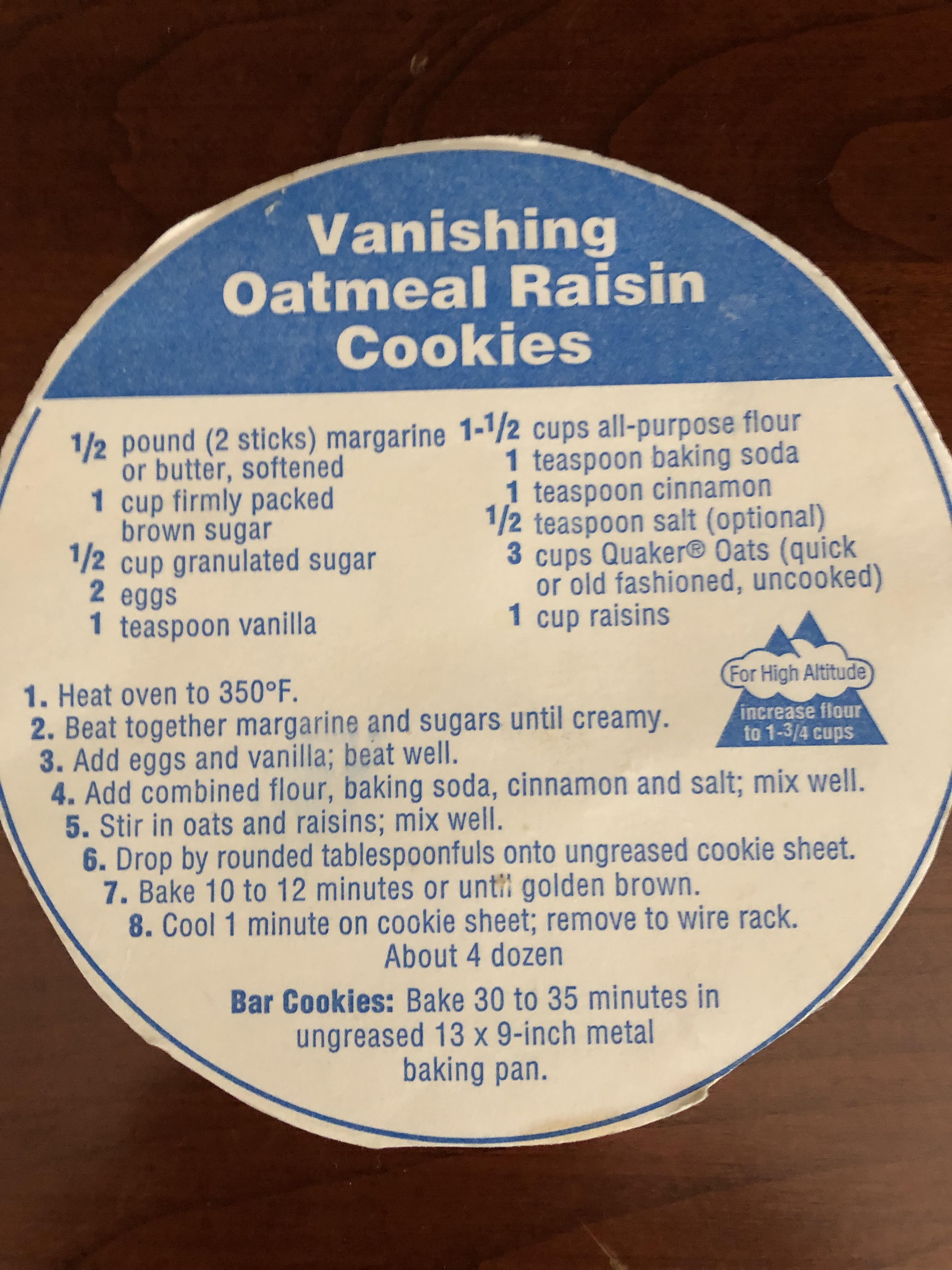 This recipe is the actual inside of a lid from a famous brand of oats. Mimi’s cookie recipe is kind of a secret because of her omissions, substitutions, and changes to the recipe after all these years.