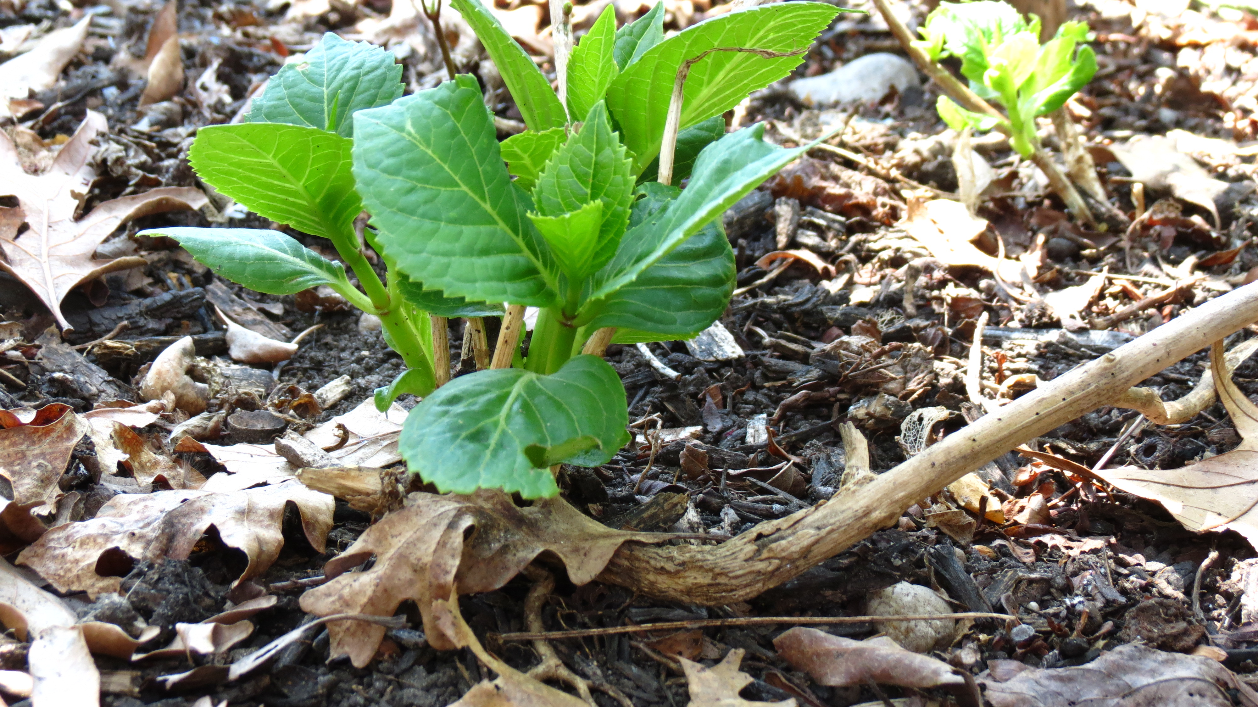 As I brushed away brown winter leaves from the base of a hydrangea, I noticed that a mature branch had touched the ground. Roots had emerged and grabbed hold, and now a green stem and leaves rose from the contact point.